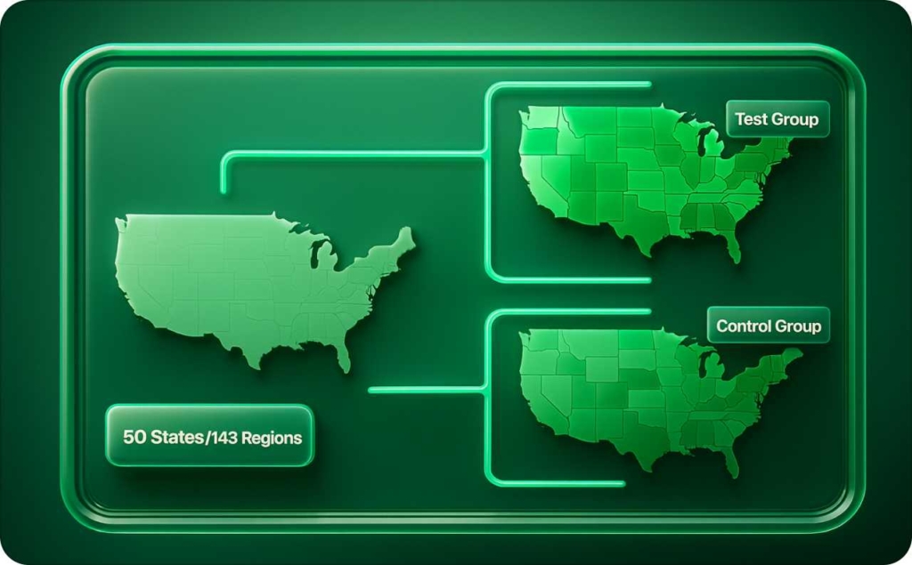 Splits audiences by geography or audience segment to compare complete creative bundles.