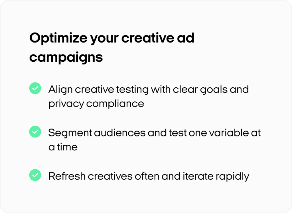 You just need to lean on first-party data, like email engagement or site activity, and use aggregated reporting tools like GA4 or Meta’s Ads Manager. These privacy-compliant methods still give you enough insight to run effective A/B testing for ads.