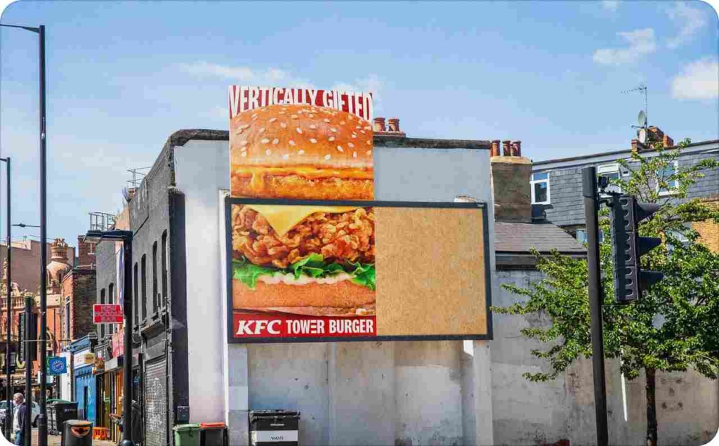 An oversized billboard advertising stunt that showed a towering burger rising above the street — playful exaggeration at its best.