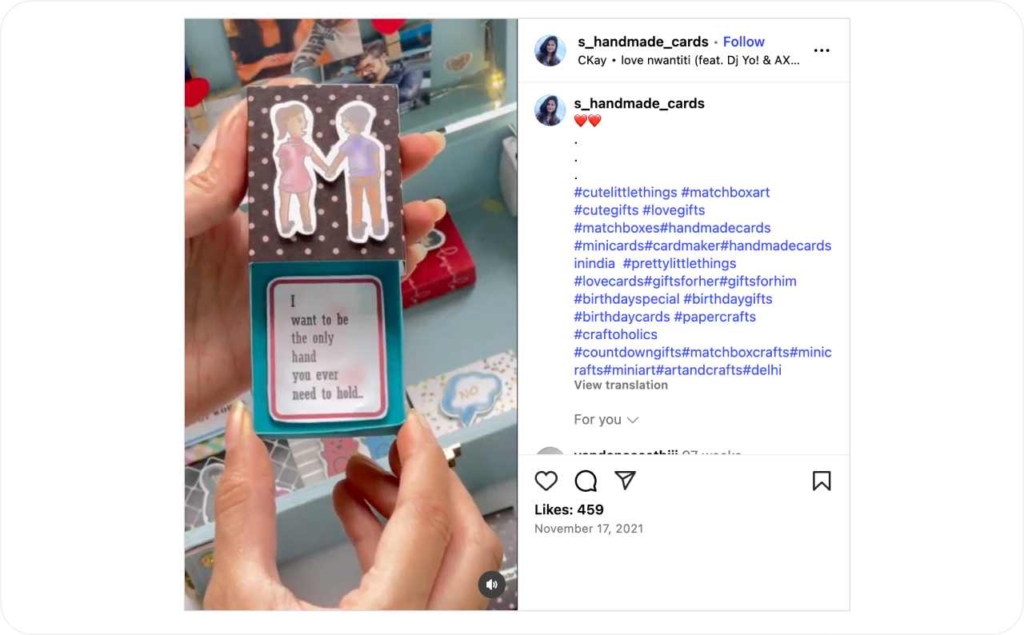 Cards by Shairy turned the art of handmade gifting into a compelling video series on Instagram Reels. They use the best techniques to create engaging reels. Each short-form video captured the card-making process in crisp, high-speed edits — from paper selection to final embellishment. Using natural lighting and minimal editing, the Reels felt like behind-the-scenes peeks into a real workspace. On-screen text delivered clear value with phrases like “zero-waste packaging” and “gift-ready in minutes,” making the content both charming and informative.