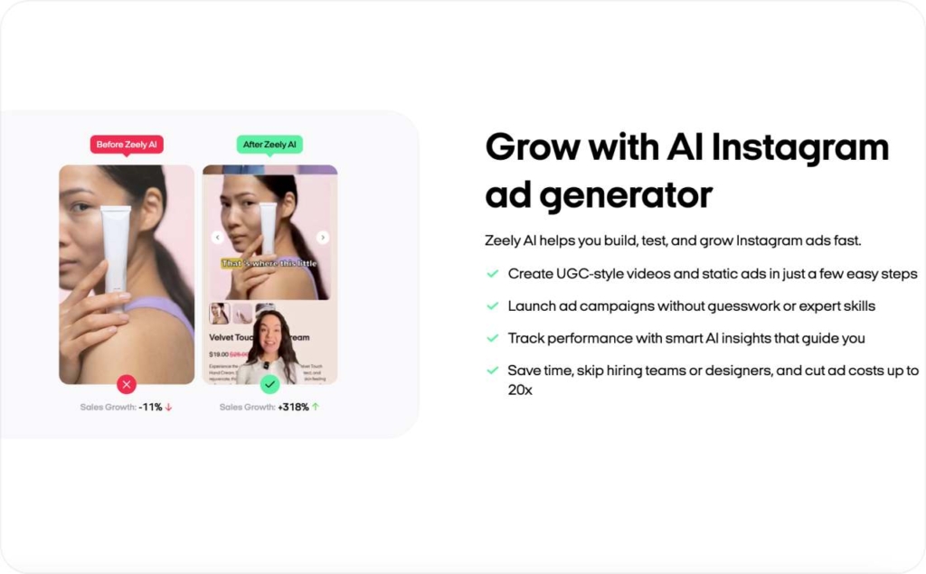 Whether you’re promoting a product drop, running a limited-time offer, or building your brand from the ground up, Zeely AI ads generator gives you pro-quality Instagram content — no team, no tools, no stress.