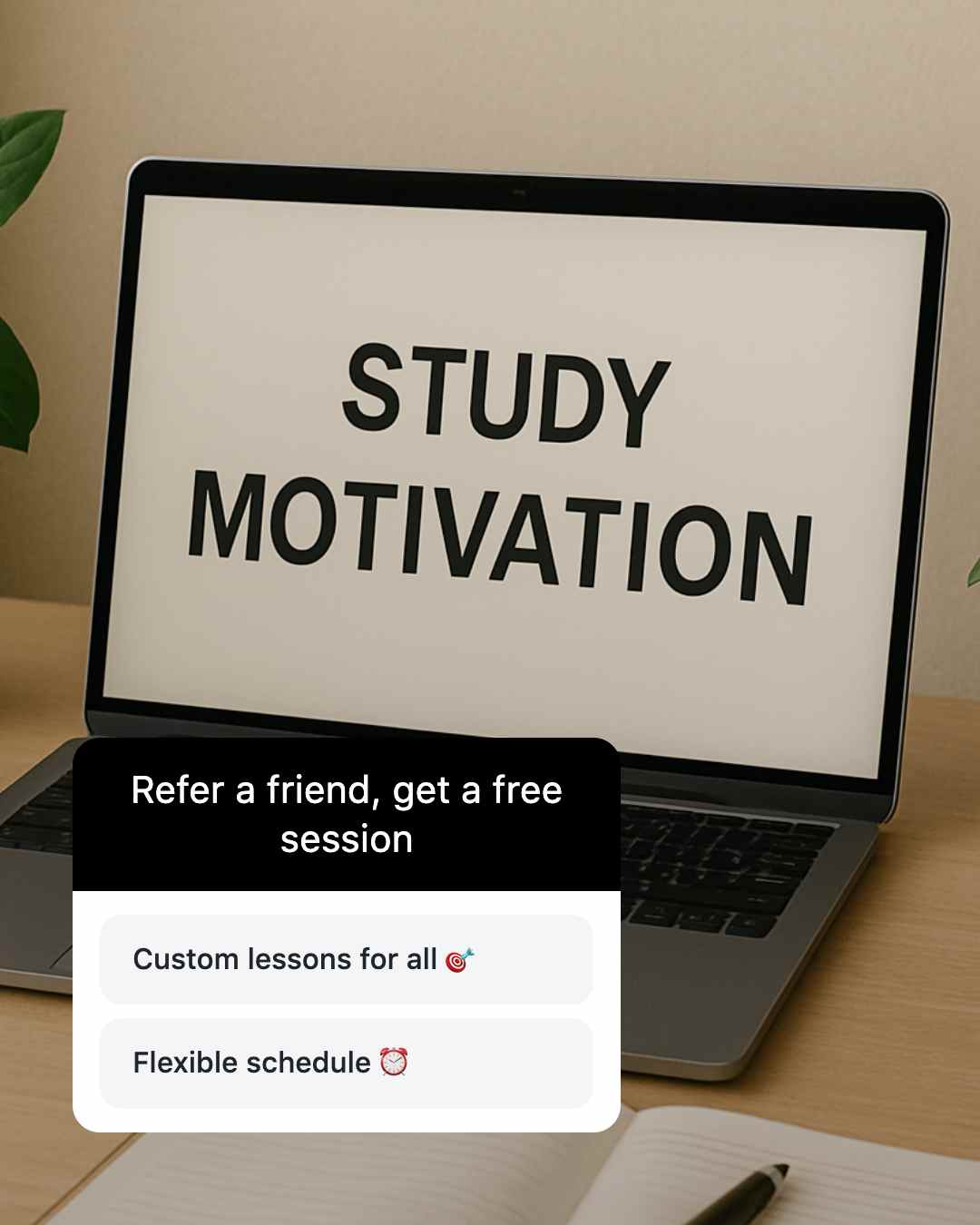 Run on Instagram Reels, TikTok, or YouTube Shorts with bold overlays like “8 weeks → higher grades.” Use a clear CTA linking directly to a free diagnostic booking page.